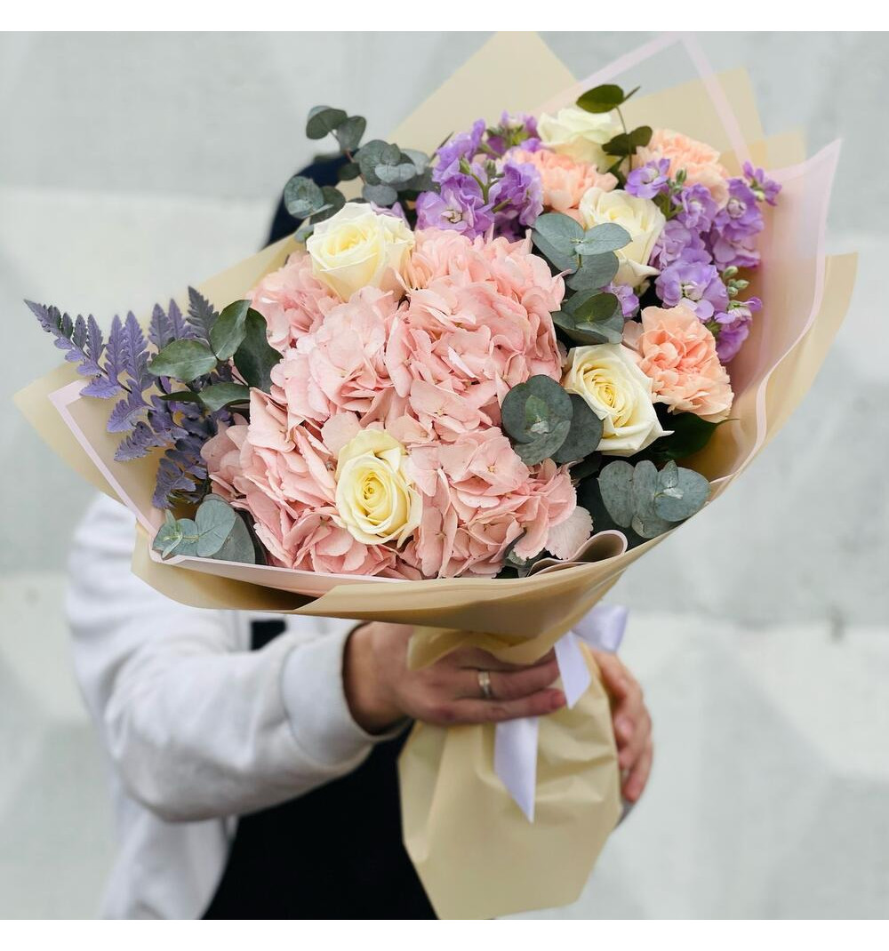 "Нежный авторский букет" - это прекрасное сочетание элегантных роз и изящных гортензий, создающих волшебную атмосферу нежности и романтики. Букет олицетворяет теплоту и ласку, а его неповторимый дизайн делает его особенным и уникальным. Розы символизируют любовь и привязанность, а гортензии придают букету пышность и изящество. Этот нежный букет станет прекрасным подарком для любого особенного момента или праздника, даря радость и счастье получателю.